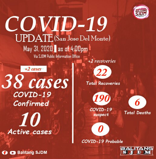 Sa kasalukuyan ay nasa 38 na ang kabuuang kaso ng COVID-19 sa lungsod, 10 dito ang active cases, 22 ang recoveries habang nananatiling 6 ang death cases. | Source: SJDM Public Information Office
