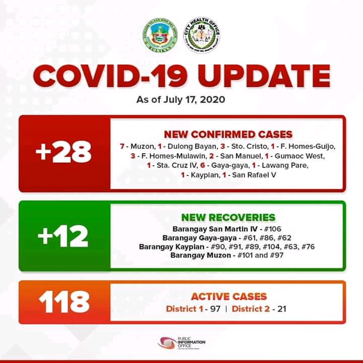 Naitala ang 28 mga panibagong kumpirmadong kaso ng COVID-19 habang 12 ang mga bagong recoveries na nadagdag ngayong araw, Hulyo 17, sa San Jose del Monte, City ayon sa SJDM Public Information Office.