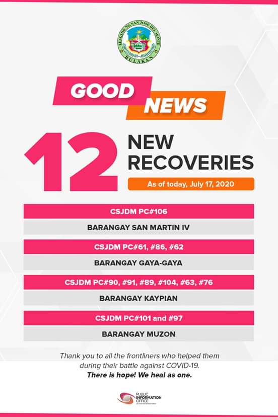 City of San Jose del Monte Public Information Office (CSJDM PIO) announced 12 new recoveries from coronavirus disease 2019 (COVID-19), July 17.