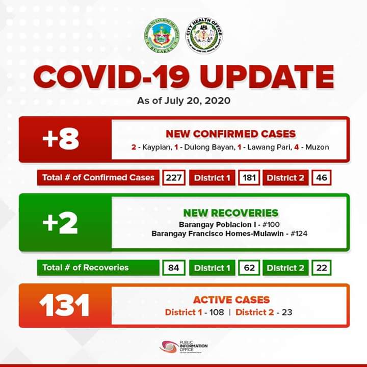 Naitala ang walong (8) bagong kaso ng Corona Virus Disease 2019 (COVID-19) habang dalawa (2) naman ang nadagdag sa mga gumaling sa San Jose del Monte, Bulacan ngayong araw.