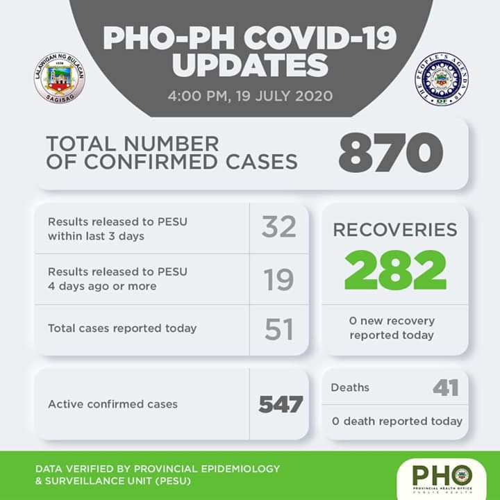 Kaugnay nito, naitala kahapon, Hulyo 19, ng Bulacan Provincial Health Office ang 51 nadagdag sa mga nagpositibo sa COVID-19 sa lalawigan. Sa kabuuan, 870 ang kumpirmadong kaso habang 547 dito ang active cases.