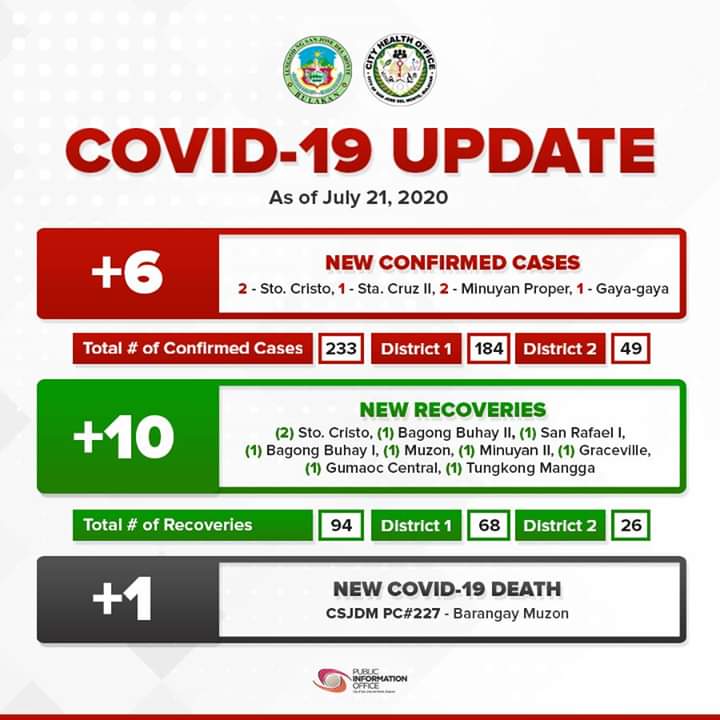 Naitala ang anim (6) na panibagong kaso ng Coronavirus disease 2019 (COVID-19) habang sampu (10) ang nadagdag sa mga naka-rekober sa sakit sa San Jose del Monte City ngayong araw.