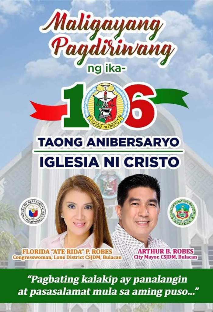 Pagbating kalakip ay panalangin at pasasalamat sa lahat ng miyembro at ministro ng Iglesia ni Cristo mula sa Doble Aksyon na sina Mayor Arthur Robes at Congw. Ate Rida Robes.