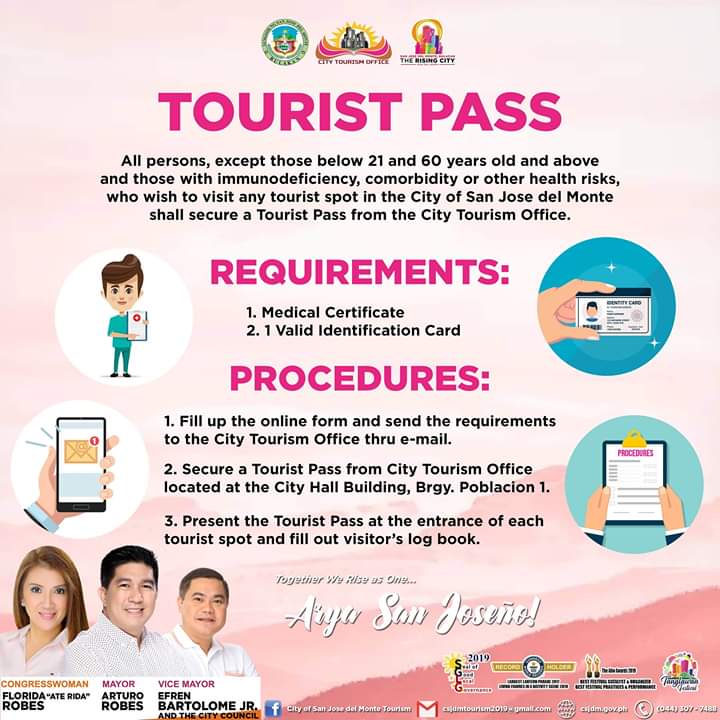 2. Lahat ng turista, maliban na lamang sa may mga edad na 21 taong gulang pababa at 60 taong gulang pataas pati na rin ang may mga immunodeficiency, comorbidity at iba pang may mga sakit sa kalusugan, na gustong bumisita sa kahit na anong tourist spot ng CSJDM ay kinakailangang magkaroon ng Tourist Pass galing sa City Tourism Office.