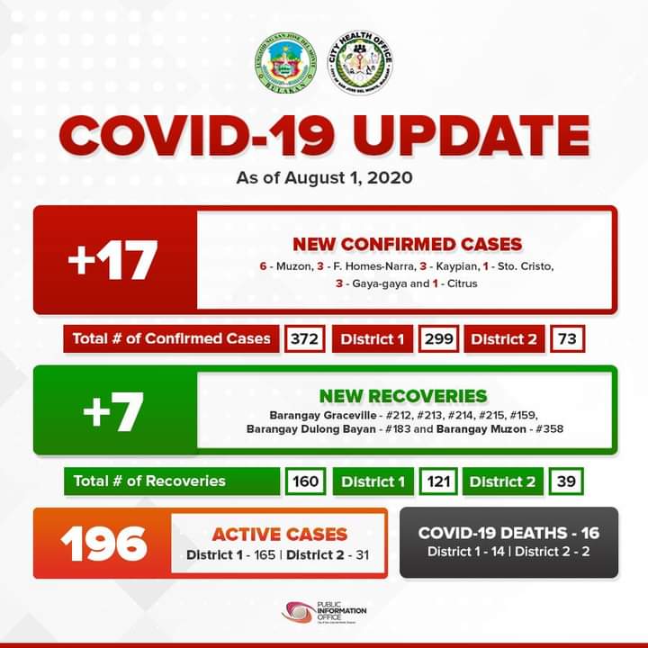 Naitala ang 17 na panibagong kaso ng Coronavirus Disease 2019 (COVID-19) habang pito (7) naman ang nadagdag sa mga gumaling sa sakit sa San Jose del Monte City ngayong araw.