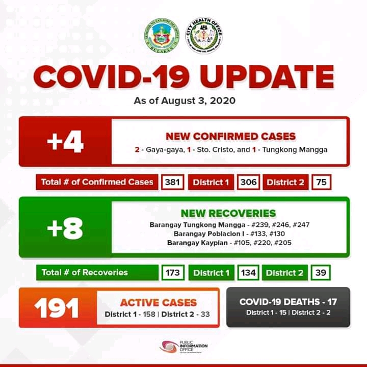 Naitala ang apat (4) na panibagong kaso ng Coronavirus Disease 2019 (COVID-19) habang walo (8) naman ang nadagdag sa mga gumaling sa sakit sa San Jose del Monte City ngayong araw, Agosto 3.