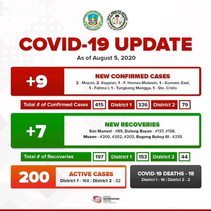 Naitala ang siyam (9) na panibagong kaso ng Coronavirus Disease 2019 (COVID-19) habang pito (7) naman ang nadagdag sa mga gumaling sa sakit sa San Jose del Monte City ngayong araw, Agosto 5.
