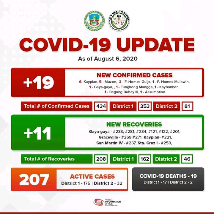 Naitala ang 19 na panibagong kaso ng Coronavirus Disease 2019 (COVID-19) habang 11 naman ang nadagdag sa mga gumaling sa sakit sa San Jose del Monte City ngayong araw, Agosto 6.
