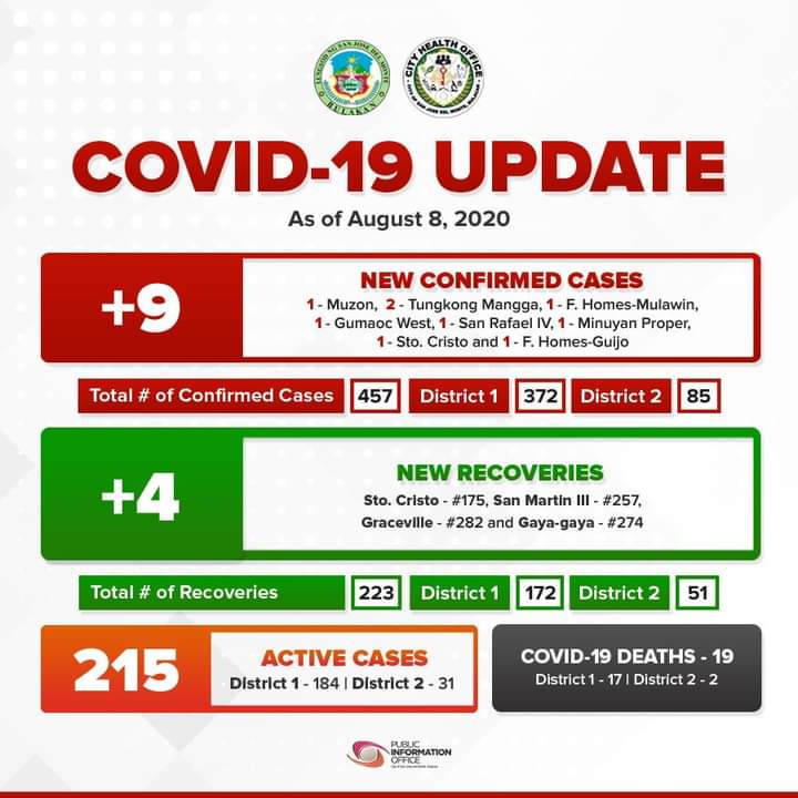Naitala ang siyam (9) na panibagong kaso ng Coronavirus Disease 2019 (COVID-19) habang 4 naman ang nadagdag sa mga gumaling sa sakit sa San Jose del Monte City kahapon, Agosto 8.